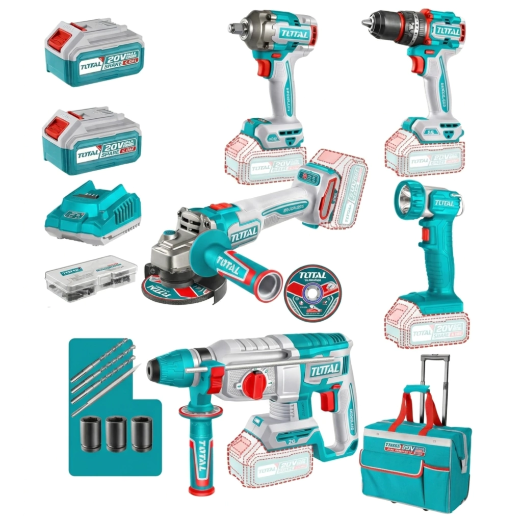 El Kit de 5 Herramientas Inalámbricas 20V Total es la solución definitiva para profesionales de la construcción, talleres y mantenimiento industrial. Este set de la línea Industrial combina la potencia de los motores sin carbones (Brushless) con la versatilidad de compartir la misma batería en todas tus máquinas.