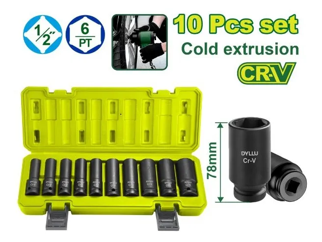 Llega donde otros no pueden. Este set de 10 bocallave de impacto DYLLU (DTMS1D01) destaca por su diseño extralargo de 76 mm, ideal para trabajar con espárragos sobresalientes y tuercas en cavidades profundas que requieren la potencia de una llave de impacto.