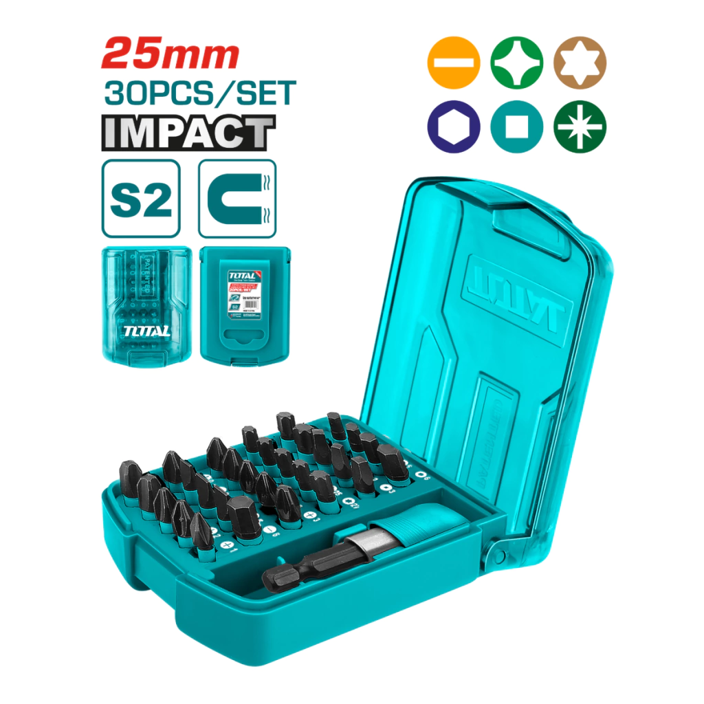 El Total TACSD18306 es un set profesional de 30 piezas diseñado para ofrecer máxima durabilidad y rendimiento en tareas de atornillado e impacto. Fabricado en acero industrial S2, garantiza una excelente resistencia a la torsión y al desgaste, ideal para trabajos exigentes tanto en talleres como en obras.