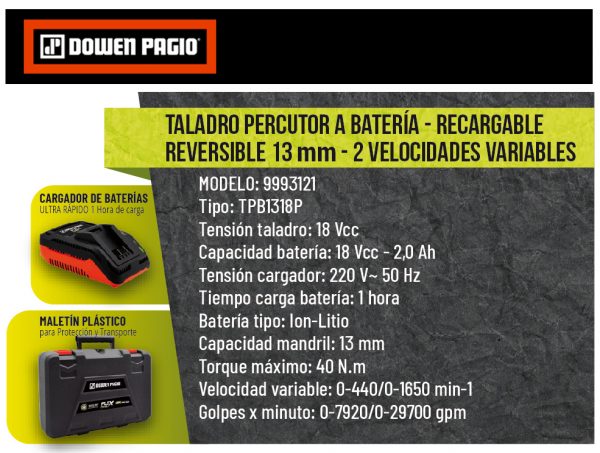 El Taladro Percutor Dowen Paggio TPB1318P es la herramienta definitiva para profesionales y hobbistas exigentes que buscan potencia sin cables. Gracias a su función percutora y su robusto mandril metálico, permite perforar mampostería, madera y metal con total precisión.